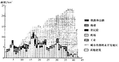 2、单选题 某沿海城市人口达1600万,约60%居住在离市中心3千米的范围内。城市人口54%居住在贫民窟。下图示意该城市与大型商贸中心不同距离段的用地构成。据此完成1~3题。