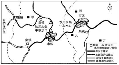 (1)根据图例可知,图中饮用水集中取水口位于河流上游,其主要因素是水质。
