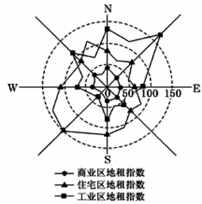 2、单选题 城市地域功能区地租指数是指城市某功能区单位面积土地租金与该区人口日流通量的比值。下图为世界某城市地域功能区地租指数与布局方位雷达图。读图回答下列各题。