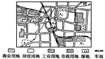 3、综合题 下图为“某中等城市土地利用分布示意图”,读图回答下列问题。