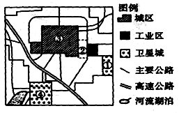 小题2:消防车库应布局在的城区的外围,离城区近;疗养院布局在城市的外围,环境优美的地方,④处有河流湖泊,有净化空气的作用。符合的是②和④。