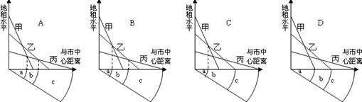 本题解析:本题考查城市功能分区。经济因素对城市功能分区的直接影响是:各项经济活动的付租能力高,则选择该项经济活动。故甲表示商业活动的付租水平变化线,乙表示住宅活动的付租水平变化线,丙表示工业活动的付租水平变化线;故符合商业付租能力最高的区域做商业区;住宅付租能力最高的区域作住宅区的图示,为B图。