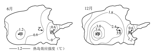 3、单选题 热岛效应强度是指城区与郊区的气温差。下图示意北方某特大城市城区2008年6月和12月热岛效应强度分布。读图完成下列各题。
