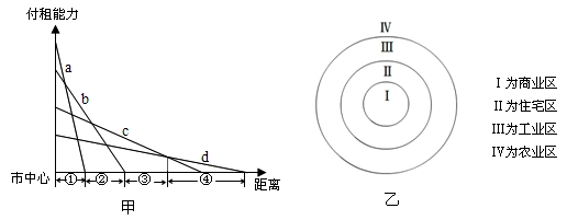 4、单选题 图中甲为各类土地利用付租能力示意图,乙为某城市的功能分区模型图(假设在同一均质平面条件下)。回答27、28题。
