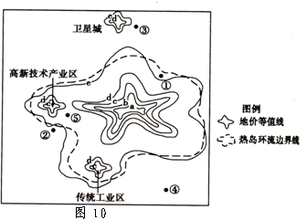 2、单选题 图10是“该城市地价分布概念图”(地价等值线数值a、b、c、d、e依次递减),图中地价等值线弯曲程度的大小主要受