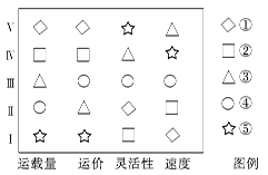 本题解析:本题考查交通运输方式的选择。①从运载量和运价方面看最差,而从速度上比较最好,可推断是航空,鲜花不易保鲜且附加值高,从中国运到日本应选用航空;②从运载量和运价方面看仅好于航空,但灵活性和速度都较好,应是公路,一般进行短距离运输,不能用来长距离运输石油;③速度最慢、灵活 性差,但运价较低,应是河运,不能把小麦从中国运到美国;④在运价、灵活性、速度方面都居中,运量大,应是铁路;⑤在运载量和运价方面最好,但在灵活性和速度方面较差,应是海运,一般用来运送大吨位、长距 离的商品如铁矿石、石油、小麦等的国际跨海贸易。