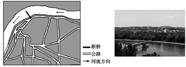 河流在弯曲段存在“凹岸侵蚀,凸岸堆积”的现象。法国罗纳河上的圣贝内泽桥始建于1177年,13世纪和15世纪曾大修和重建,1668年被废弃。1669年的大洪水冲毁了河流右岸的桥墩,后来左岸的残桥(图左侧图中粗实线)成为旅游景点——圣贝内泽断桥(图右照片)。