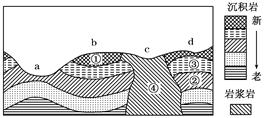 1.图中a地所属地质构造是2.图中①②③④处的岩层,形成时间最晚的是3.图中a、b、c、d四地,最可能储藏地下水的是