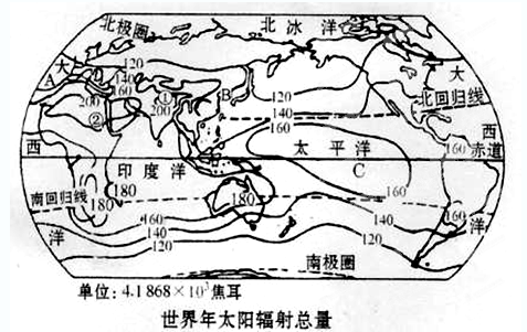 1、综合题 下图是世界年太阳辐射量分布图,读图回答问题 (10分)