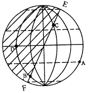 (4)有一个人从B点沿经线向D点发射炮弹,该炮弹可能落在D点的 侧。
