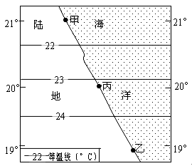 5、单选题 气温的日变化一般表现为最高值出现在14时左右,最低值出现在日出前后。下图示意某区域某日某时刻的等温线分布,该日丙地的正午太阳高度达一年中最大值。读图回答下列各题。