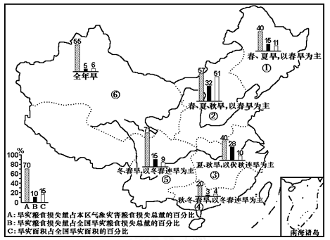 2、综合题 干旱灾害是中国主要的气象灾害之一。下图反映了我国1950-1991年间不同区域季节分布及其对农业的影响,读图回答下列问题。(10分)