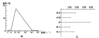 2、单选题 滑坡是我国山区常发生的一种地质灾害。?图中的甲为某滑坡区域坡度面积频率分布图,乙为某滑坡区域土质分布图。读图回答问题。