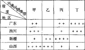 1、单选题 下表代表寒潮、酸雨、水土流失、土地荒漠化对四个省区的危害程度(十号越多代表危害程度越高),回答(1)一(2)题。