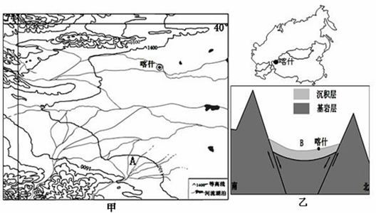 材料二:图中甲、乙两图为喀什所在区域图和地质剖面图。