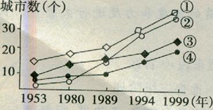 5、单选题  下图中四条曲线分别代表珠江三角洲、长江三角洲、京津唐和辽中南四地区城市数量的变化过程。读图,回答1~2题。