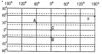 1、综合题  读“世界经纬网示意图”,回答下列问题:(8分)