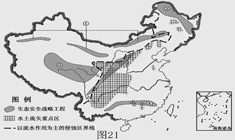 2、综合题 图21是我国水土流失重点区和生态安全战略工程分布示意图。读图回答下列问题。 (10分)