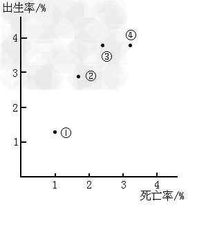 5、单选题  甲市2008 年户籍人口出生9 .67 万人,出生率为0 .699% ;死亡10 .7 万人,死亡率为0 .773% 。甲市户籍人口这种自然增长态势已持续14 年。图上显示四个地区的人口出生率和死亡率。据此完成1-2 题.