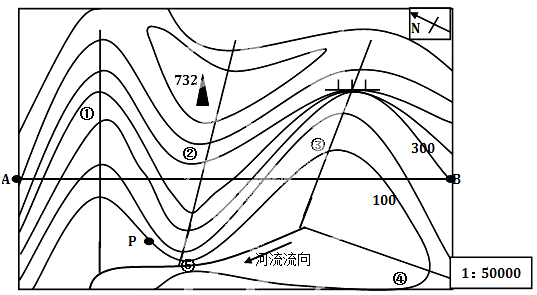 (1)在等高线地形图上,等高线闭合,数值从中心向四周逐渐降低的是山地;等高线闭合,数值从中心向四周逐渐升高的是盆地或洼地;两组数值从中心向四周逐渐降低的闭合等高线之间的区域的是鞍部;等高线弯曲部分向低值处凸出是山脊(也叫分水岭);等高线从低值处向高值处凸出是山谷;等高线交会处是陡崖。一般来说在山谷地区容易形成河流,据图可知:图中①②③三处,②处是山脊,不能形成河流。地球上定向的方法很多:有指向标的,根据:“箭头指示北方”来确定方向;有经纬网的,根据“纬线指示东西方向,经线指示南北方向”来确定方向;既无指向标,有无经纬网的的一般地图,我们根据“上北下南,左西右东”来确定方向。本题中有指向标,我们根据指向标可以判断河流④支流的流向是由南向北。