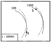 小题2:若图示区域自然带为亚热带常绿硬叶林带,则该地为地中海气候,据上题分析,该地在北半球,1月降水受盛行西风带(西南风)影响,b地位于山谷迎风坡,a地位于山谷背风坡,所以b地降水比a地多 ;7月该区域晴天为主,b为阳坡,光照比a充足;两条等温线与两条等高线相交于谷底,两交点海拔相差500米,温度相差约3℃,因为对流层的温度每升高100米气温降低0.60C,也就是说两条等温线之间的温差为3℃,a、b两地位于两条等温线之间,温差应该小于3℃;图中比例尺表示图上一厘米代表实际距离1千米即1公里,ab之间图上远没有10厘米,故选A。