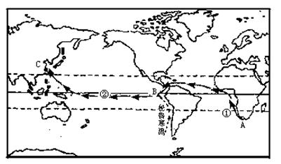1.船只出发时,A处是冬季。经过三个月后到达C处,此时C处为2.图中①和②处相比3.航行途中记载的下列现象,不可信的是4.B处为加拉帕戈斯群岛,岛上栖息着企鹅和海豹,原因是