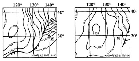 2.试题分析:该时间段内,M点所处区域气压差减小,风力减弱,则知②正确。20日14点M点位于冷锋锋前,盛行偏南风,21日5点时M点位于冷锋锋后,盛行西北风,表明M点经历了冷锋天气,M点气温降低。由此分析可以推断,①、②、④说法正确,③说法错误。故B为正确选项。
