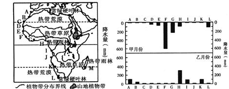 4、综合题 所给左图是“非洲大陆植物类型分布示意图”,右图上下两部分是“非洲西部沿海A—L各地一月份和七月份降水量示意图”,读图回答。(16分)