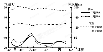 2、单选题 读某国2°E经线附近气温、降水量分布图,关于图中甲、乙、丙三地的分析,正确的是
