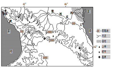 4、综合题 第22届冬季奥林匹克运动会将于2014年2月在俄罗斯索契市举行。下图为世界某区域图和甲、乙两沿海城市的气候统计图。结合相关材料,完成下列问题。(14分)