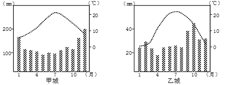 甲城降水明显多于乙城(1分)。甲城盛行海风(迎岸风),水汽充足(1分);乙城盛行离岸风,水汽少(1分)。