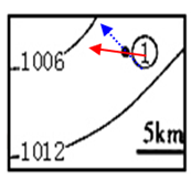 小题2:①地的风向是偏东风。如下图所示,蓝色虚线为气压梯度力方向,红色实线箭头为风向。