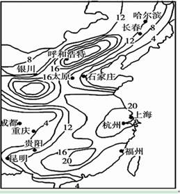 低温冷冻灾害主要是因为来自极地的强冷空气,及寒潮侵入造成的连续多日气温下降,使作物因环境温度过低而受到损伤以致减产的农业气象灾害。图12为我国部分地区平均每年冻害出现的次数等值线图(单位:次)。读图回答下列问题。