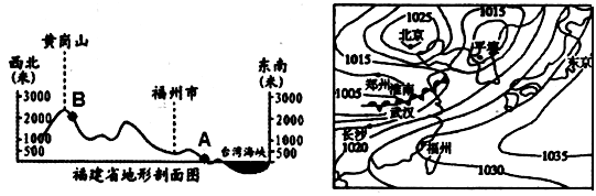 【小题1】从右图可以看出,我国江淮地区形成准静止锋,为春末夏初,此时我国福建省大部分地区位于西太平洋副热带高压脊北侧,盛行偏南风(东南风),左图中的A、B位于山地迎风坡,从A到B方向,随着海拔高度上升,降水逐渐增多,之后海拔高度降低,降水减少,之后海拔高度上升,降水增多。
