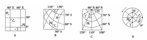 4、单选题 下列四幅图中,甲地在乙地西北,丙地在丁地东南的是( )?