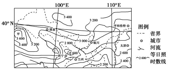 (3) 写出图中甲、乙区域年日照时数范围,并分别分析原因。(10分)