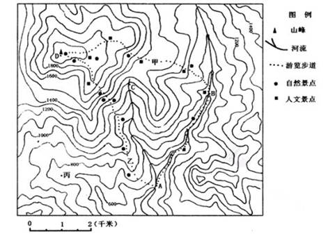(2)由图等高线分布和图例可知线路甲等高线稀疏,坡度较小,自然景点和人文景点数目多,但路程长;线路乙路程短,沿途等高线密集,坡度较大,沿线大多为自然景点。