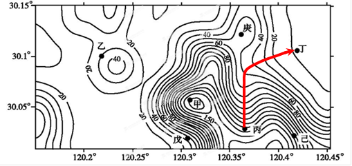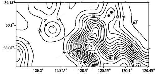 小题1:根据图中经纬度可以判断该地位于浙江省东北部杭州市附近,读图中等高线最高处甲地海拔高度在180米以下,低于200米,虽然图中等高线比较密集,但是最大相对高差不足170米,图中等高线最密集的地方实地距离大约3-5千米,地面坡度小于5°,地面起伏较小,地形类型应该属于平原,所属地形单元应该是太湖平原(长江三角洲)故答案选B。