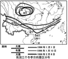 材料一:一般认为气温在1℃以下时就可以产生霜冻,下图是“我国1996年三个冬季日的霜区分布图”。