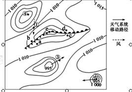小题2:图中b位于冷锋的锋后,d位于暖锋的锋前,e位于低压中心附近,这些区域多降水,故选A.