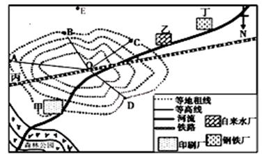 小题1:住宅区是城市用地面积最大的功能区,读图,根据曲线分布情况,甲分布面积最大,所以甲为住宅用地。在城市的郊区,工业区布局面积要比商业区的用地面积大,在市中心区商业区的用地面积要比工业用地面积大,所以丙是商业用地,乙是工业用地。C对。A、B、D错。