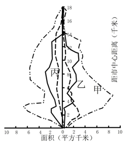 1、单选题 下图为“某城市不同主要功能区占用土地面积空间变化曲线图”。读图回答下列各题。