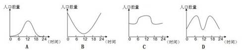 小题3:结合前面分析,甲为住宅区,住宅区夜间人口数量最多,白天由于出行导致人口数量逐渐减少。所以B对。A、C、D错。