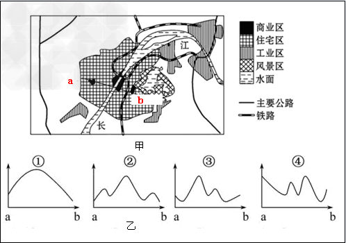 2、单选题 下图中甲图是我国某城市内部功能分区图,能正确表示ab间地租变化的曲线是乙图中的