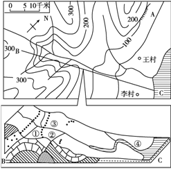 4、综合题  图为我国东南沿海某区域等高线图及沿BC剖面线的地质剖面图。读图,回答下列问题:(8分)