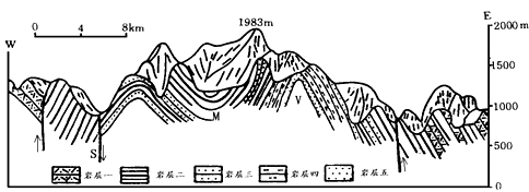 A.S—向斜—山谷 M—背斜—山地 V—断层—山谷