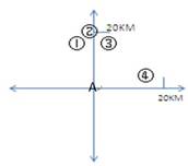 3、单选题 我军炮兵在某海岛A处进行试射,炮弹射程20公里,如果向正北方向发射,由于地转偏向力的影响,这发炮弹最可能将落在以下哪个地方(?)