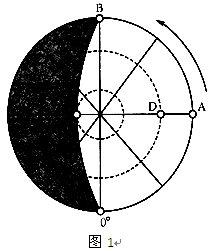 1、综合题 (12分)下l到示意某I-1昼夜分布状况,阴影部分表示黑夜,地球扁率忽略不计。图中虚线为北极圈,此时D点地方时为6时。读图回答有关问题。