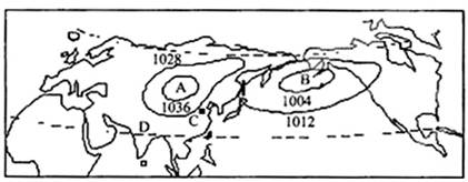 【小题3】根据此时北半球的气压中心分布判断为北半球冬季,故C位于东亚,形成西北风;D位于南亚,形成东北风。冬季我国受西北季风影响,寒冷干燥。