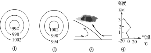 小题2:风力较小,大气层比较稳定,空气流动性差,空气中的微小颗粒聚集,漂浮在空气中,形成雾霾天气。低气压控制时,中心盛行上升气流,污染的空气容易扩散;锋面过境时,两侧的气压梯度比较大,风比较大,污染空气也容易扩散,低压、锋面影响时下雨天气也较多,雨后空气中尘埃物质少,也不易形成雾霾天气,所以①③影响时不易形成雾霾天气;反气旋控制时,中心盛行下沉气流,尘埃物质不容易扩散,上空出现逆温时(温度随高度增加而升高时),不利于空气的对流运动,污染的空气也不易扩散,它们控制下的地区天气晴朗,因此②、④天气系统容易形成雾霾天气。